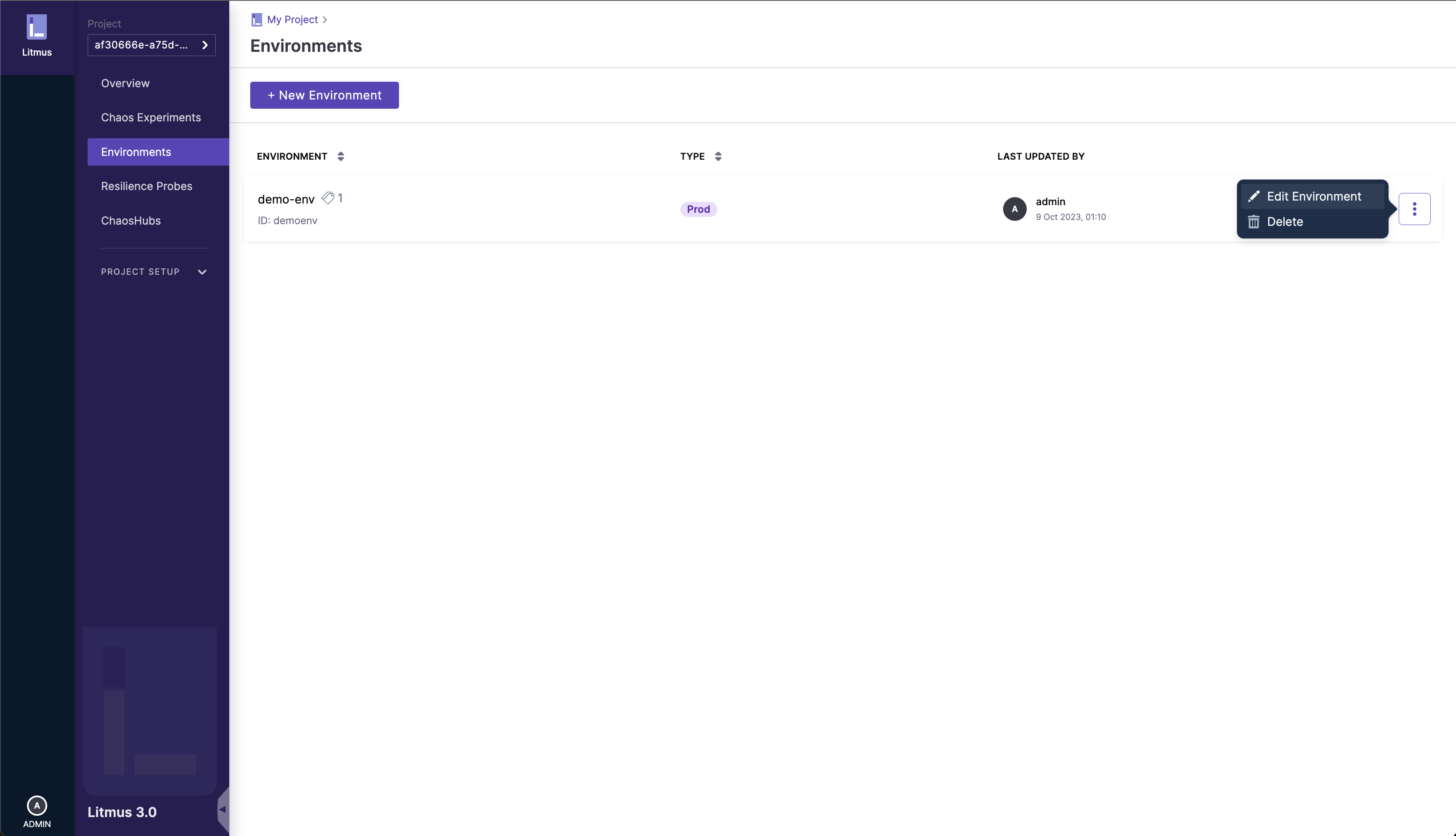 Navigate to the /environments page (Environments sidebar option on the left nav), click on the â‹® icon to open the options menu and select Edit Environment option: