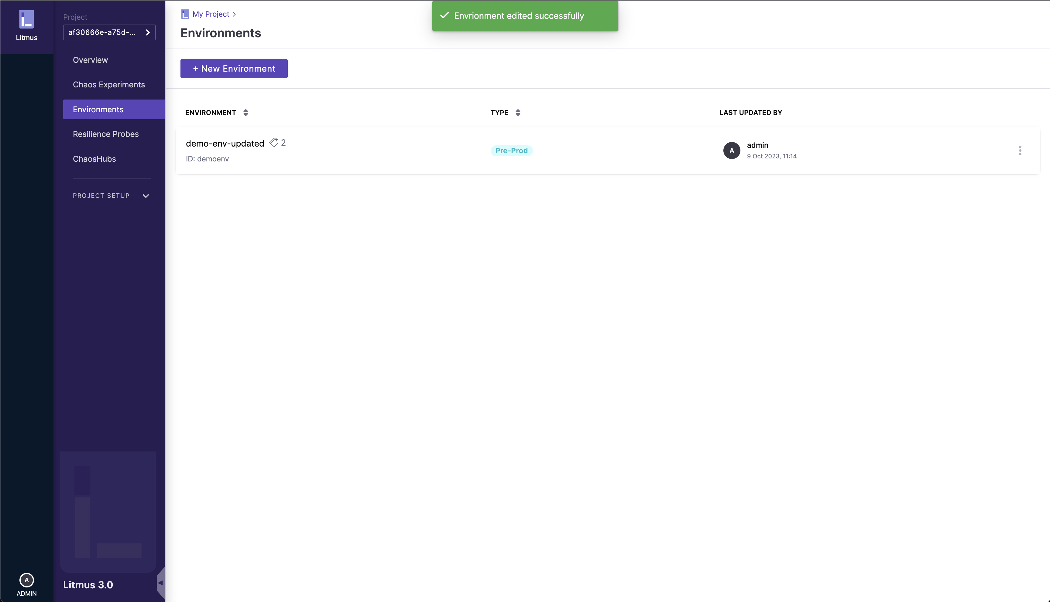 The updated environment details will appear in the list as shown: